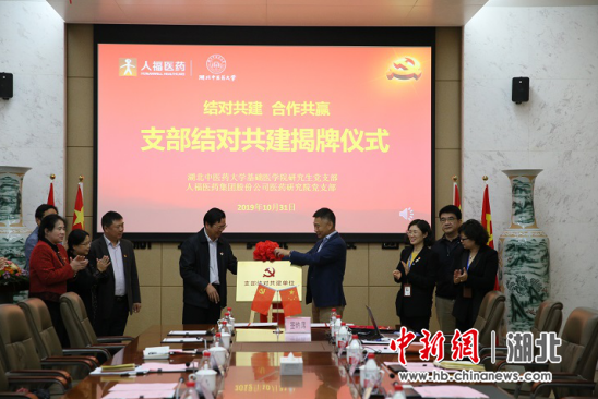 中新网湖北新闻11月1日电 (王磊 陈鹏)湖北中医药大学和人福医药集团党支部结对共建活动10月31日在人福医药集团举行。湖北中医药大学党委书记阮力艰和人福医药集团党委书记、董事长王学海共同为校企党支部结对共建揭牌。